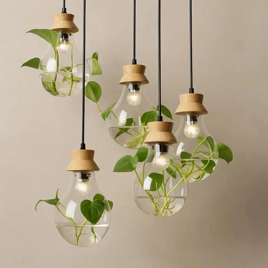 - Suspensions organiques en rotin ou lin pour une ambiance douce.